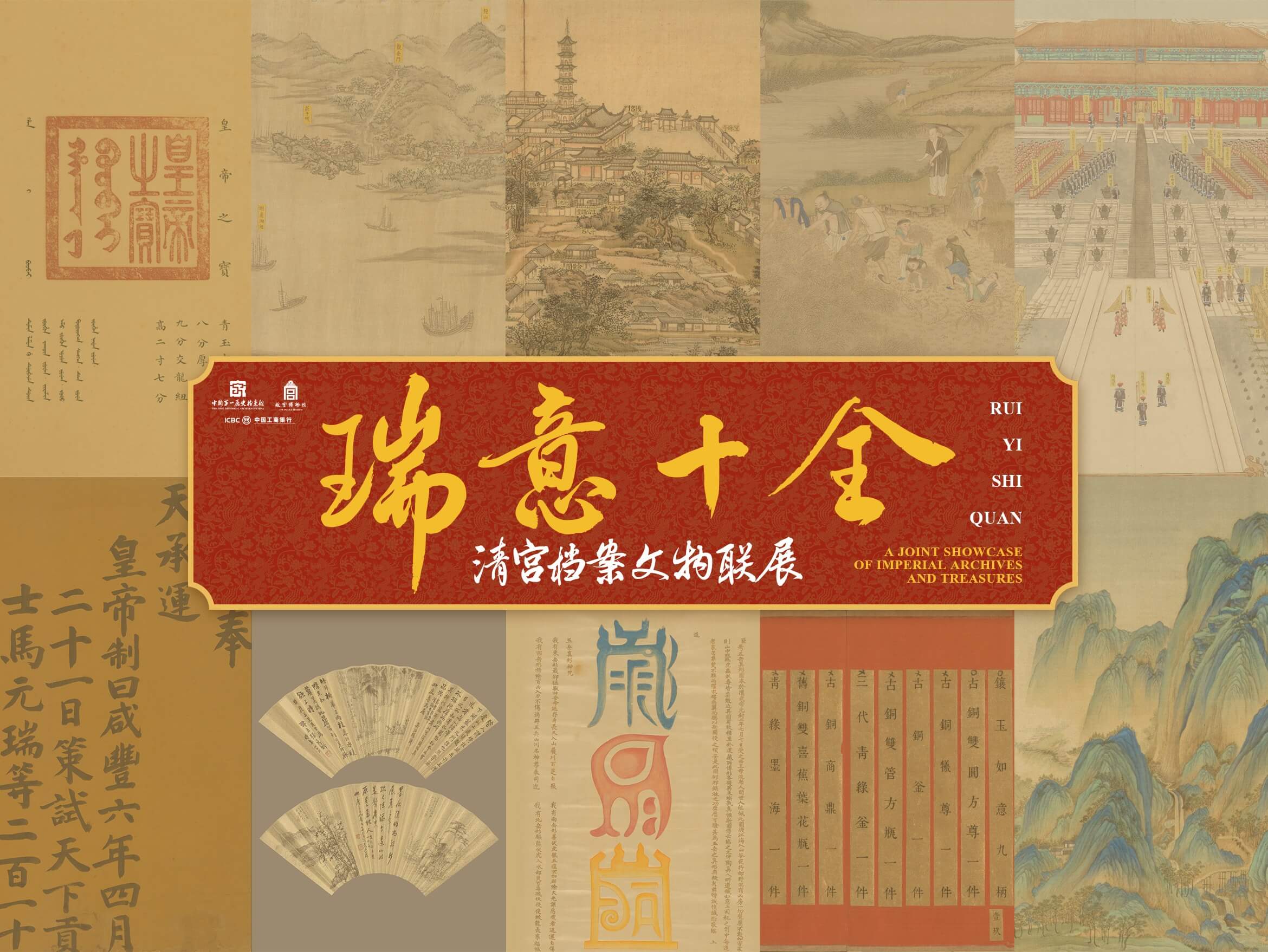 值此建馆百年,由中国第一历史档案馆联合故宫博物院精心打造、共同举办的“瑞意十全:清宫档案文物联展”于10月11日在中国第一历史档案馆正式开展。展览以“十全”命名,寓意着“十全十美”,代表着美好人生、美好愿景、美好未来,更是中国第一历史档案馆在建馆百年之际,对祖国、对事业、对每一名参观者的真挚祝福。展览分为“国泰民安”“人生如意”“家国同庆”三个单元,采用“档案+文物”合璧式的叙述方式,精心构建金瓯永固、治世升平、四时风物、物阜民康、凤凰于飞、蟾宫折桂、金兰相契、良辰美景、福寿康宁、文脉绵长共10个“瑞意”主题,通过“同一事件、同一空间”探寻档案与文物之间深厚的内在联系,讲述档案与文物背后的历史故事。